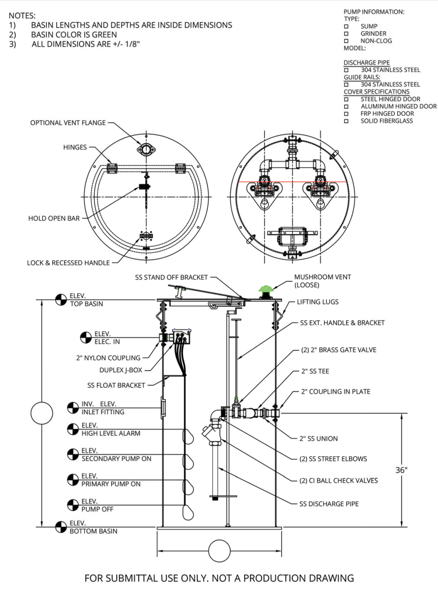 All AK Industries packaged sewage basin lift stations come complete with everything needed for a quality installation. The only things you need to provide are the pump of your choice, underground piping and electric cable. Below is a general listing of the items included with each system. Key structural components (PVC, Galvanized, Ductile and Stainless Steel) will vary depending on the selection you make in the Rail & Plumbing chart in the guide.