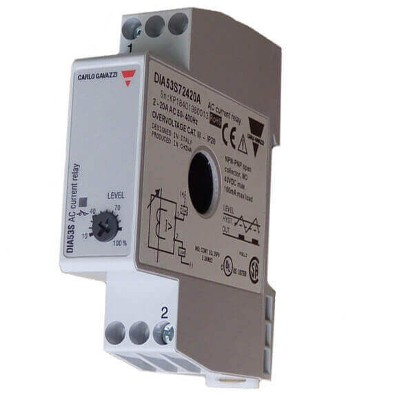 Small current monitoring relay with built-in current transformer with adjustable set-point and integrated solid state output. Self-powered and 2-wire connection for easy use. 12mm hole for insulated current carrying wire makes it suitable for most applications. For mounting on DIN-rail. 17.5mm wide housing suitable both for back and front panel mounting.