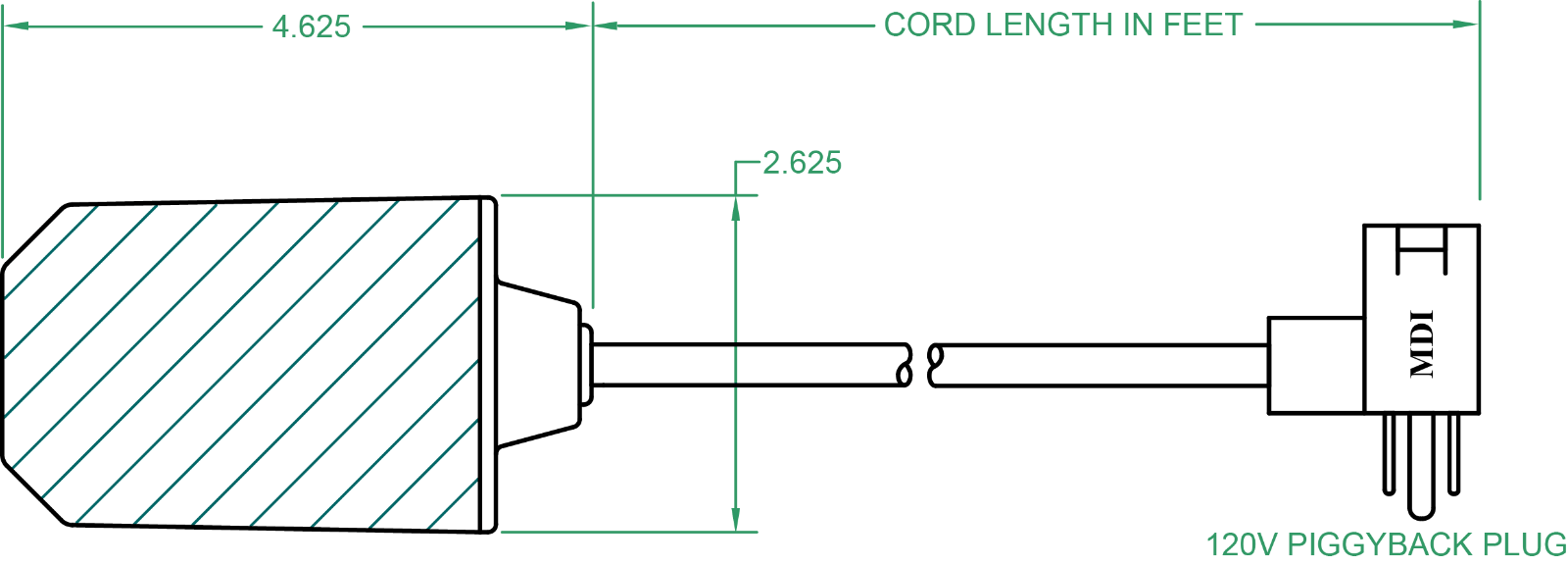 This float has a 120 VAC Piggyback Plug, where no junction boxes or complicated electrical connections are needed. Plug the switch into a standard 120 VAC outlet, and plug your pump into the piggyback plug.