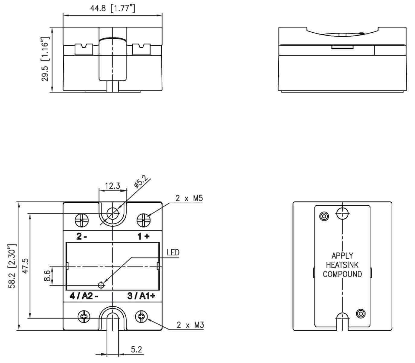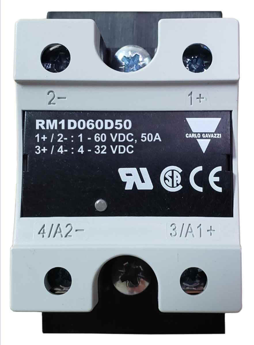 The RM1D060D50 H expands the range of DC solid state switching solutions up to 50 A for supply voltages up to 60 VDC. This new range is suitable for mounting on a heatsink or for panel mounting (Special Ordered). The switching of the RM1D060D50 H is controlled by a DC voltage in the range of 4 to 32 V. An LED indicates control voltage presence on the SSR.