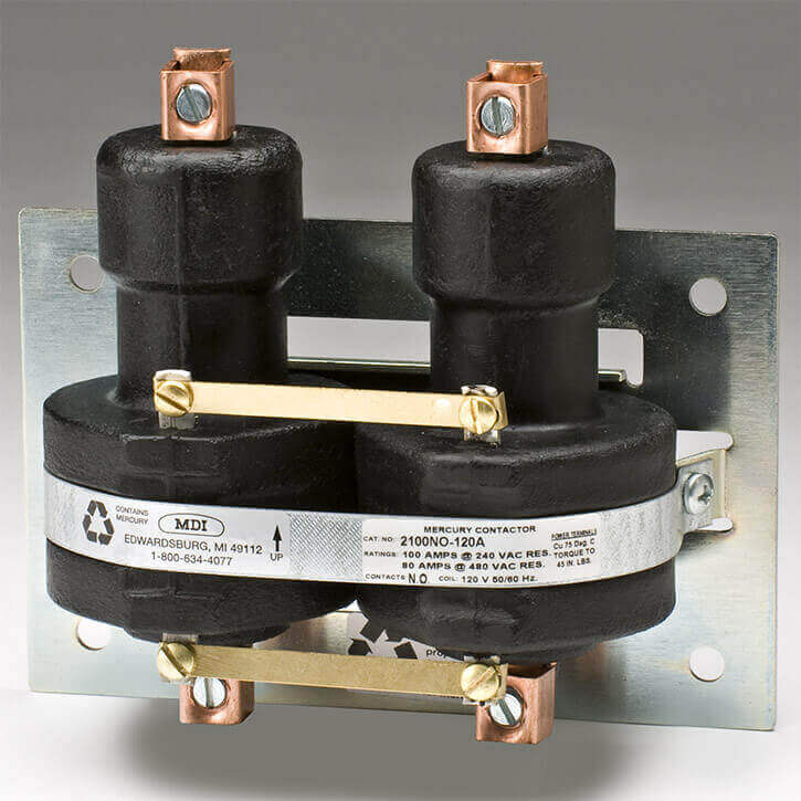 The 100-AMP normally open contactors are designed and manufactured to high quality specifications and the contactors are commonly used in various heating, lighting, and many other industrial applications including high voltage ultraviolet type loads. The contacts are encased in hermetically sealed stainless steel tubes to provide reliable switching for millions of operations. MDI has manufactured this contactor since 1975. It is available in the single, two, three & four pole models.
