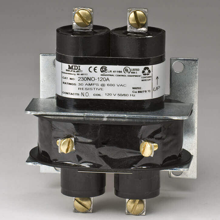 Contactors are rated from 30 to 100 Amperes and are commonly used in various heating, lighting, and many other industrial applications including high voltage ultraviolet type loads. The contacts are encased in hermetically sealed stainless steel tubes to provide reliable switching for millions of operations. All basic units are UL, CSA, and CE approved.