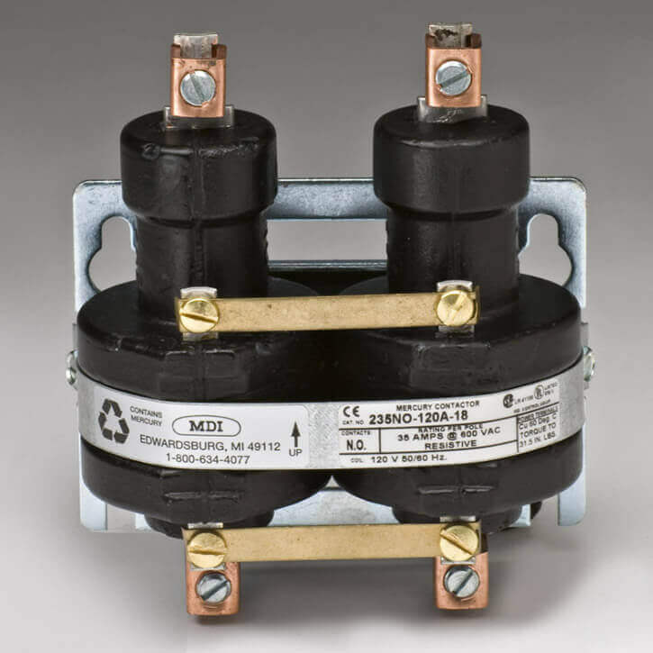 The 35-AMP normally open contactors are designed and manufactured to high quality specifications and the contactors are commonly used in various heating, lighting, and many other industrial applications including high voltage ultraviolet type loads. The contacts are encased in hermetically sealed stainless steel tubes to provide reliable switching for millions of operations. MDI has manufactured this contactor since 1975. It is available in the single, two, three & four pole models.