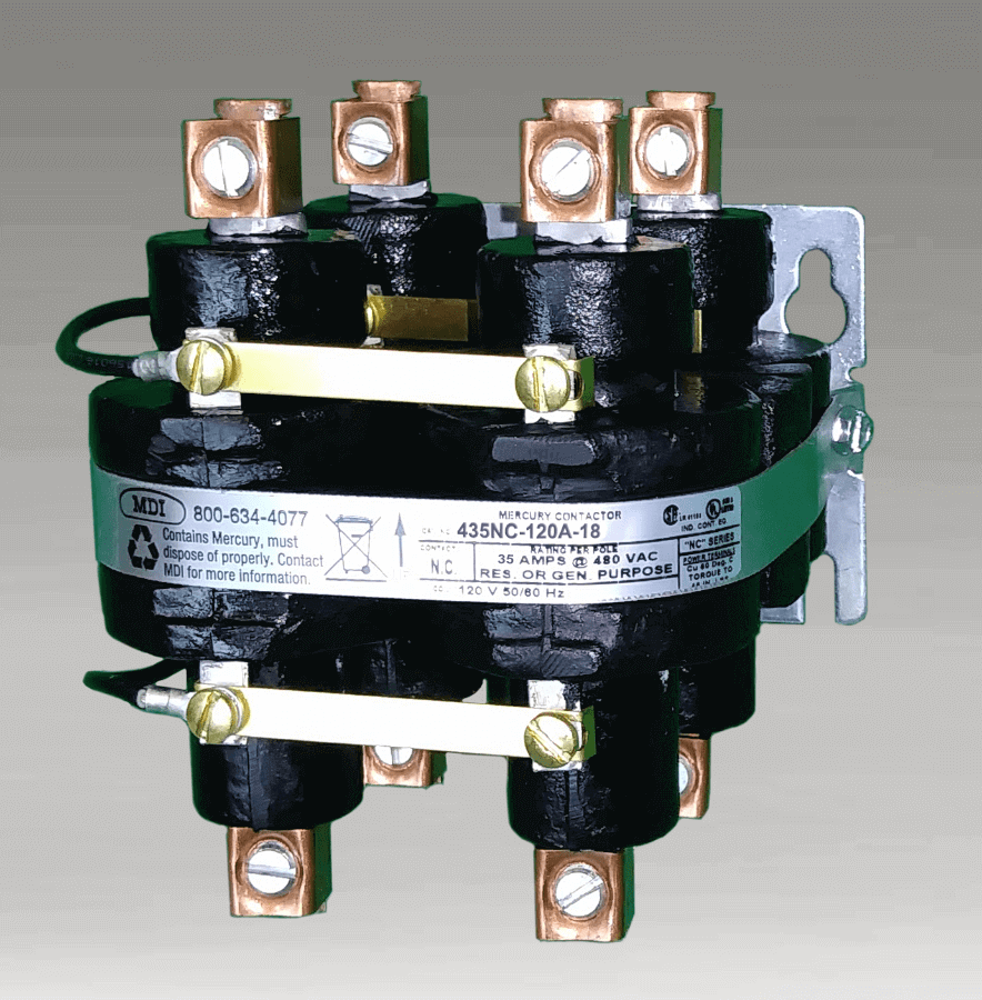 The 35-AMP normally closed contactors are designed and manufactured to high quality specifications and the contactors are commonly used in various heating, lighting, and many other industrial applications including high voltage ultraviolet type loads. The contacts are encased in hermetically sealed stainless steel tubes to provide reliable switching for millions of operations. MDI has manufactured this contactor since 1975. It is available in the single, two, three & four pole models.
