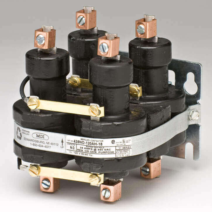 The 35-AMP normally open contactors are designed and manufactured to high quality specifications and the contactors are commonly used in various heating, lighting, and many other industrial applications including high voltage ultraviolet type loads. The contacts are encased in hermetically sealed stainless steel tubes to provide reliable switching for millions of operations. MDI has manufactured this contactor since 1975. It is available in the single, two, three & four pole models.