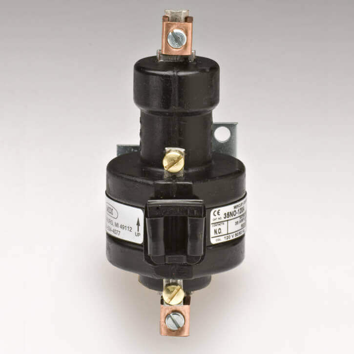 The 35-AMP normally open contactors are designed and manufactured to high quality specifications and the contactors are commonly used in various heating, lighting, and many other industrial applications including high voltage ultraviolet type loads. The contacts are encased in hermetically sealed stainless steel tubes to provide reliable switching for millions of operations. MDI has manufactured this contactor since 1975. It is available in the single, two, three & four pole models.