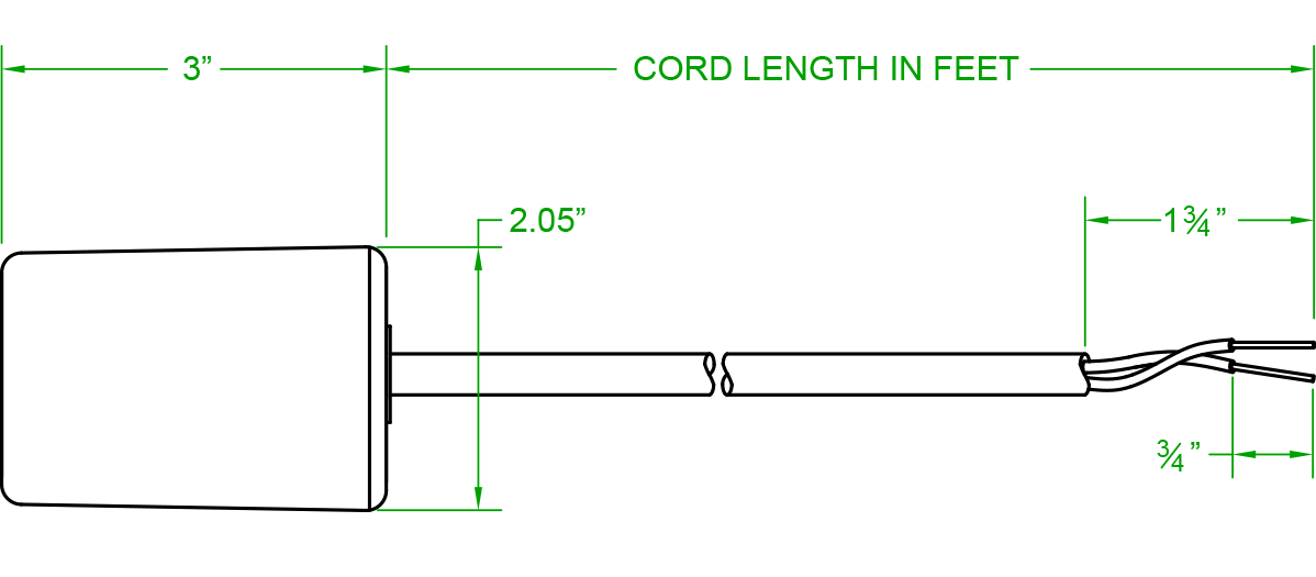 This float has skived ends, where the insulated wire leads inside the cable are intended to be wired into other system components inside a junction box.