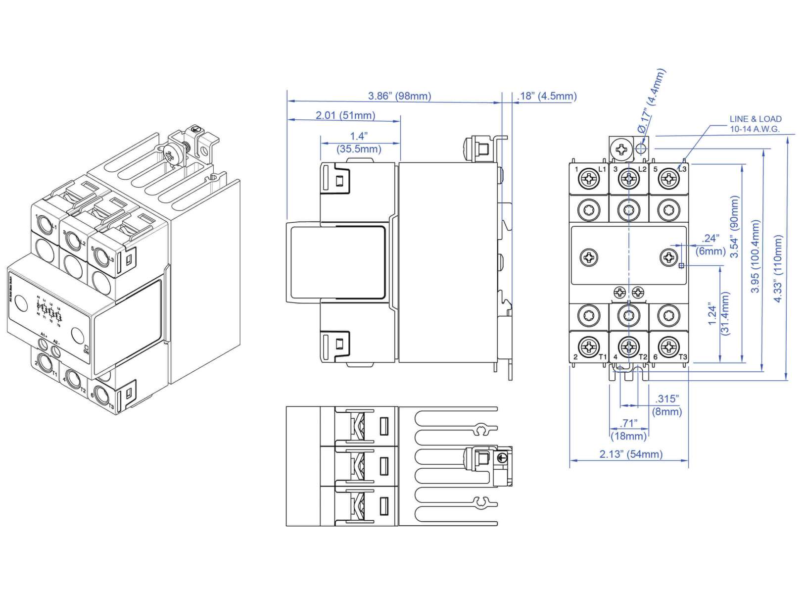 This product is intended to replace mechanical contactors especially when switching is frequent. This product width is 2.13" (54 mm).