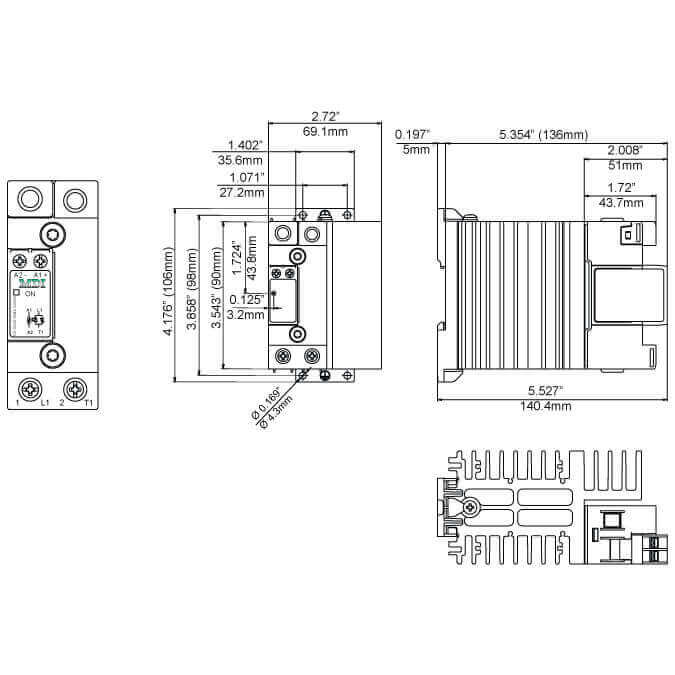 This new range of solid state contactors presents an unique opportunity to maximize efficiency in panel space and is an evolution of solid state switches. The nominal current ratings are at 104°F (40°C). The width is 2.72" (69.1mm) and is rated at 60 AAC. Power and control terminals allow for safe looping of cables.