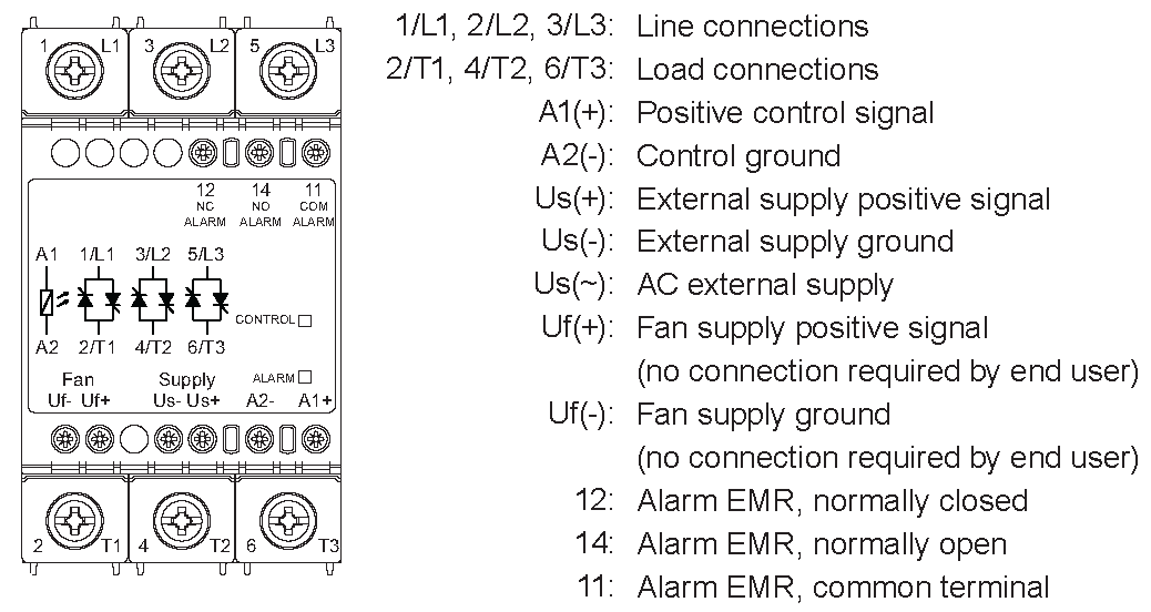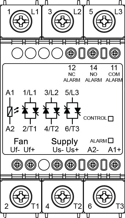 With this 3-pole switch ON occurs at the voltage zero cross and switch OFF occurs at the current zero cross. Apart from resistive and slightly inductive loads, the SSR is certified for motor switching with associated motor ratings. Varistors are integrated for output overvoltage protection. A green LED gives indication of control voltage presence. Fan operation is controlled for the versions which have an integrated fan.