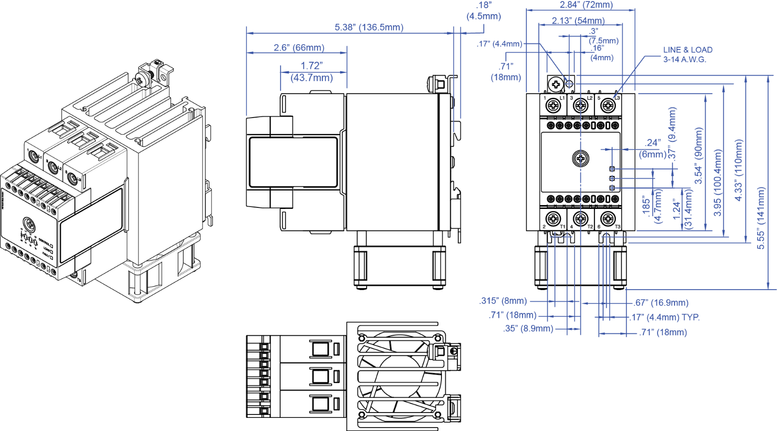 This product is intended to replace mechanical contactors especially when switching is frequent. This product width is 2.84" (72 mm).