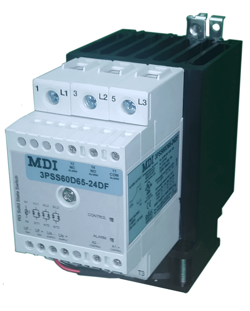 With this 3-pole switch ON occurs at the voltage zero cross and switch OFF occurs at the current zero cross. Apart from resistive and slightly inductive loads, the SSR is certified for motor switching with associated motor ratings. Varistors are integrated for output over voltage protection. A green LED gives indication of control voltage presence. Fan operation is controlled for the versions which have an integrated fan.